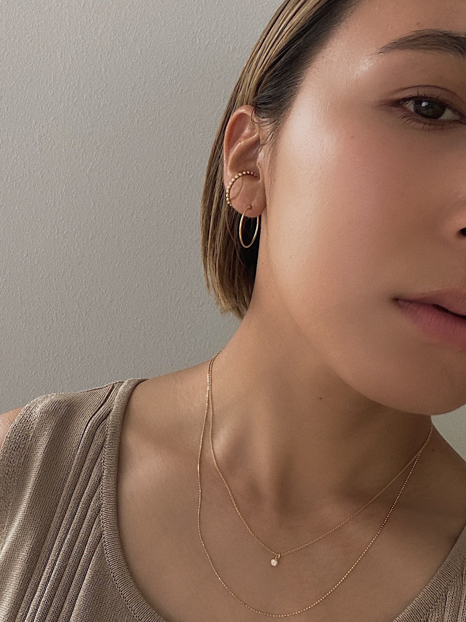 一つでも存在感があり、ネックレスとの重ね付けにもオススメの一点。
